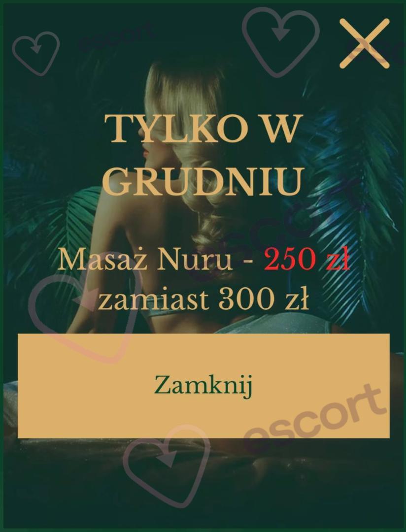 Masaż Nuru (250 zł/h, 200 zł/30min) - to masaż całego ciała wykonywany przy użyciu specjalnego olejku, lub żelu który sprawia, że doznania są wyjątkowo intensywne i relaksujące. Sesja odbywa się na macie, a Masażystka, używając swojego nagiego ciała – brzucha, piersi oraz pupy – masuje Twoje nagie ciało, pobudzając zmysły i wprowadzając w stan głębokiego erotycznego odprężenia. Masaż obejmuje również masaż lingam. Na miejscu można wybrać dowolne dodatki, aby jeszcze bardziej urozmaicić masaż i dopasować go do własnych oczekiwań.